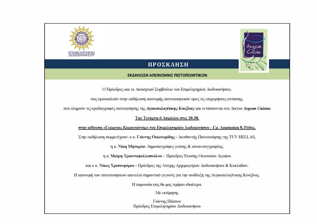Η απονομή των πιστοποιήσεων αποτελεί σημαντικό γεγονός για την ανάδειξη της Αιγαιοπελαγίτικης Κουζίνας.