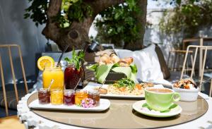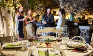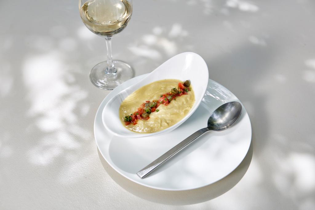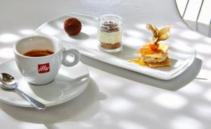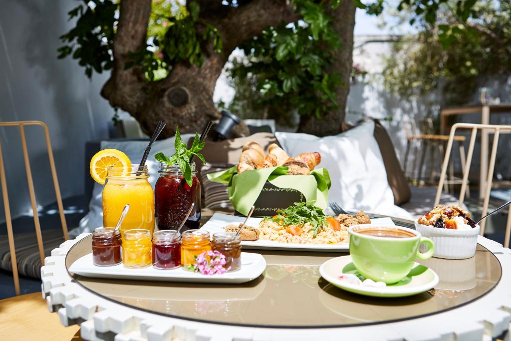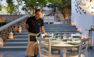 Από νωρίς το πρωί και όλη την ημέρα, ο χώρος επιδεικνύει μοντέρνα αισθητική καθώς δίνει μια αίσθηση ηρεμίας και δροσιάς από τα δέντρα και τα φυτά. Σε ένα ανεπιτήδευτο, φιλικό και χαρούμενο περιβάλλον, προσφέρουμε εξαιρετικές υπηρεσίες, πρωινά, καφέ, επιδόρπια, σνακς και υψηλής ποιότητας μοντέρνο Ελληνικό φαγητό σε συνοδεία περίπου 100 επιλεγμένων οίνων από τον ηφαιστειακό αμπελώνα του νησιού και από άλλες περιοχές της Ελλάδας..