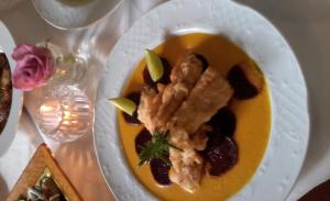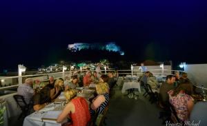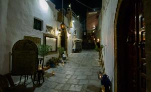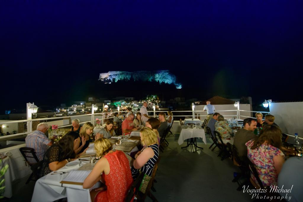 Τα ψηλά τείχη πρόσθεσαν προστασία της ιδιωτικής ζωής και βοήθησαν επίσης να κρατούν τις κατοικίες δροσερές το καλοκαίρι. Οι Έλληνες είναι γνωστοί για ισχυρούς οικογενειακούς δεσμούς τους και εμείς δεν αποτελούμε εξαίρεση. Είμαστε περήφανοι που έχουμε διατηρήσει πολλές από τις οικογενειακές κτήσεις στο εστιατόριο. Τα εργαλεία στον τοίχο ανήκανε στον παππούδες των ιδιοκτητών, οι οποίοι τα χρησιμοποιούσαν για επισκευές στα πλοία. Όλοι οι χώροι του σπιτιού εμφανίζουν τα όμορφα παραδοσιακά χειροποίητα ζωγραφισμένα πιάτα από τη Λίνδο.