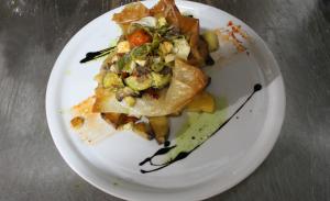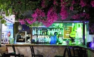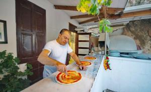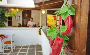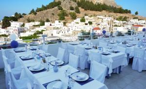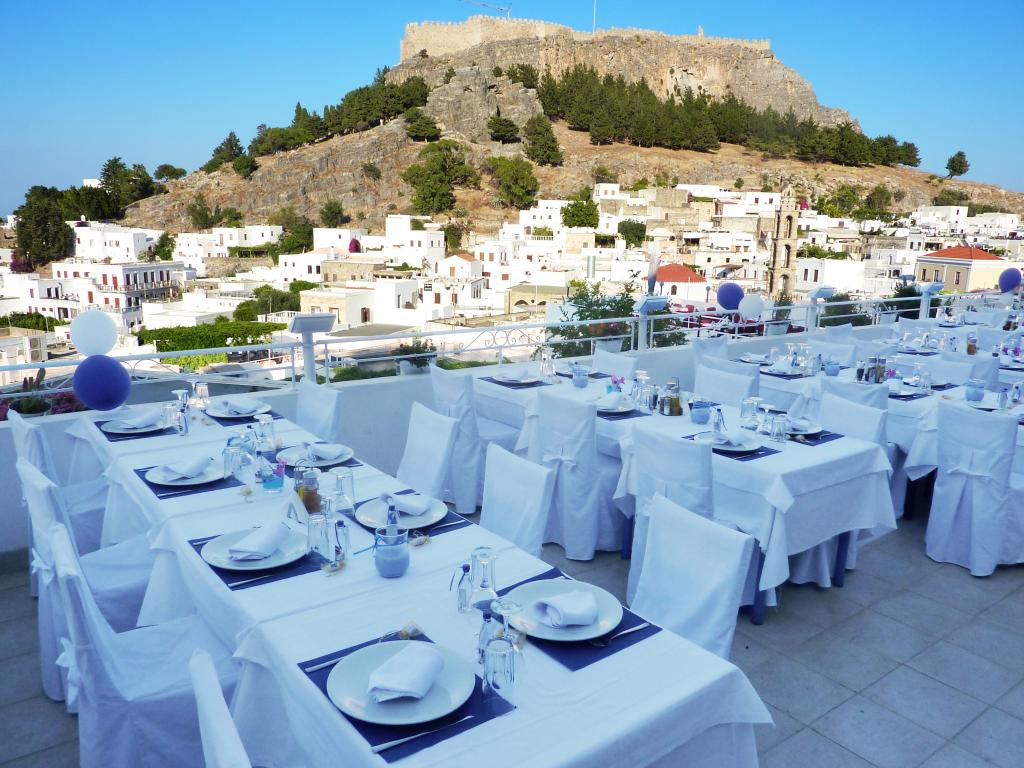 Τα μυρωδικά μας (δυόσμος, δεντρολίβανο, βάγια, ρίγανη κλπ.) καλλιεργούνται στον κήπο μας. Ο μάγειράς μας χρησιμοποιεί παρθένο ελαιόλαδο δικής μας παραγωγής. Τα λαχανικά μας προέρχονται από τοπικούς παραγωγούς, κατά το πλείστον οργανικά. Τα κρεατικά μας προέρχονται από το οικογενειακό μας κρεοπωλείο στη Λάρδο, τα περισσότερα δε, από την οικογενειακή μας φάρμα. Τα ψάρια μας είναι πάντα φρέσκα, από την θάλασσα του Αιγαίου. Το ψωμί μας παρασκευάζεται και ψήνεται στον ξυλόφουρνο, όπως και πολλά από τα προσφερόμενα κρέατά μας. Επίσης, στον ξυλόφουρνο ψήνεται και η παραδοσιακή μας ιταλική πίτσα. Φανταστική θέα, μπαλκόνι στο Αιγαίο, με την Ακρόπολη και την παραλία της Λίνδου να συνθέτουν ένα υπέροχο, ρομαντικό σκηνικό.