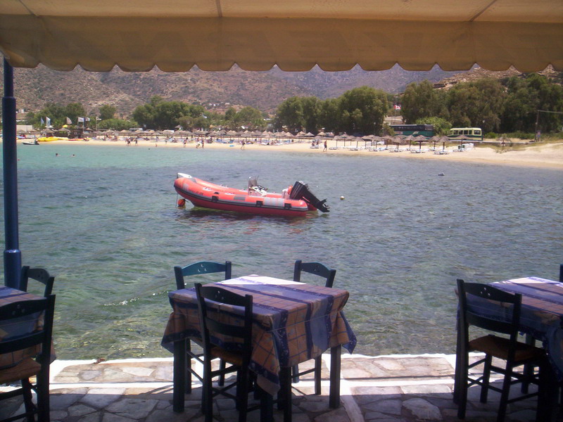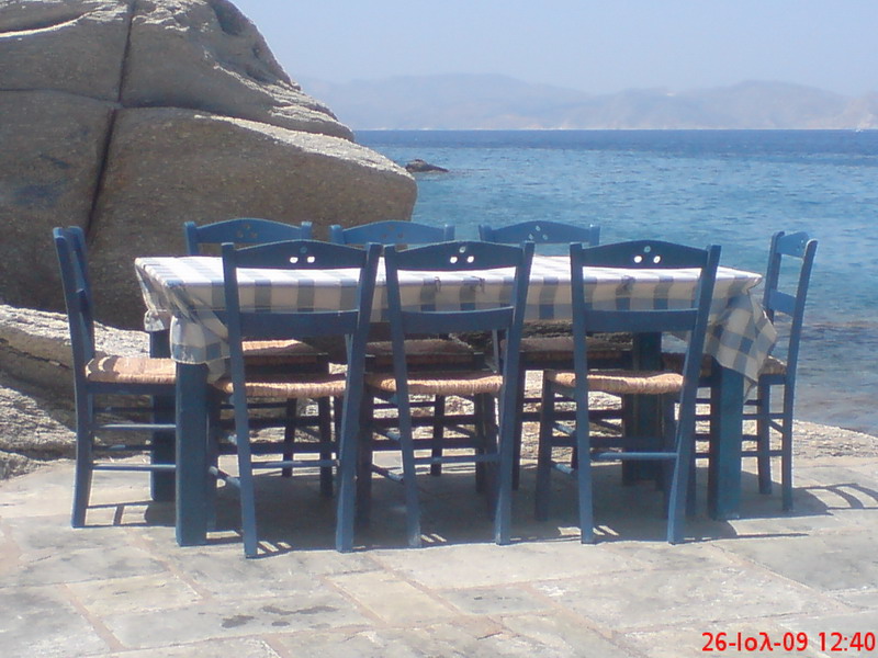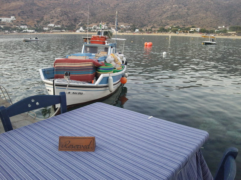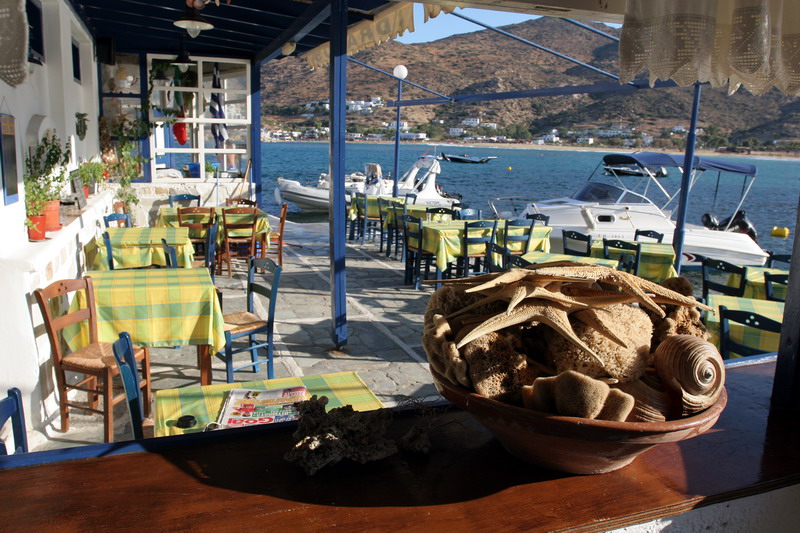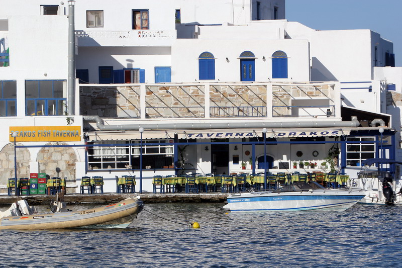 Στην Ίο, το εστιατόριο του Γιώργου Δράκου «κλείνει» τη μια άκρη του θρυλικού Μυλοπότα, σαν μικρό ακρωτήρι. Υπάρχει εκεί από τις αρχές της δεκαετίας του ’60, από τότε δηλαδή που οι χίπις παραθέριζαν στις γύρω σπηλιές. Πίσω από το εστιατόριο κρύβεται ο ήλιος όταν πάει να βασιλέψει. Είναι κομμάτι του τοπίου, σαν τη φαρδιά αμμουδιά, τα βράχια και τα σπίτια των γάλλων ζωγράφων στην απέναντι μεριά της παραλίας. Οι βάρκες είναι δεμένες και τα δίχτυα σωριασμένα κοντά στις μπλε καρέκλες. Τα κεφαλόπουλα τριγυρίζουν δίπλα ακριβώς, όπως και οι γάτες, τσιμπολογούν τα ψίχουλα που πέφτουν από τα τραπέζια στο νερό.