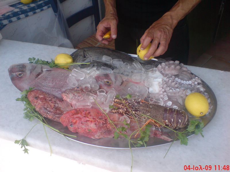 Στον πλούσιο κατάλογο των εδεσμάτων με τα ελληνικά φαγητά και, τους θαλασσινούς μεζέδες ξεχωρίζουν τα ολόφρεσκα ψάρια που μας προμηθεύουν καθημερινά οι Νιώτες και οι Καλύμνιοι ψαράδες τα οποία ψήνονται στα κάρβουνα, η αστακομακαρονάδα, το γιουβέτσι με γαρίδες και μύδια (κορυφαίο πιάτο), η μαρινάρα, το χταποδάκι που το μαγειρεύουμε με τέσσερις ξεχωριστούς τρόπους, το τηγανιτό ρύζι με θαλασσινά, η ψαρόσουπα και οι νησιώτικοι ρεβυδοκεφτέδες. Όλα αυτά συνοδεύονται από το πολύ καλό Κυκλαδίτικο χύμα κρασί ή το παραδοσιακό καραφάκι ούζο από το Πλωμάρι της Λέσβου.
