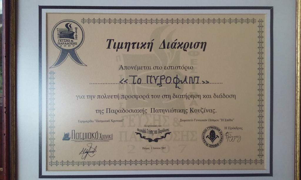Το εστιατόριο Πυροφάνι το οποίο λειτουργεί από το 1983 βρίσκεται στο κεντρικότερο σημείο του νησιού, στο λιμάνι της Σκάλας. Τα κηπευτικά προϊόντα τα οποία χρησιμοποιούμε είναι παραγωγής μας καθώς και τα θαλασσινά προέρχονται από ντόπιους ψαράδες συλλέγοντας τα την ίδια ημέρα. Το μενού του εστιατορίου περιλαμβάνει θαλασσινά, κρέατα, μαγειρευτά φαγητά και παραδοσιακούς μεζέδες βασιζόμενα στην Πατμιάκη κουζίνα. Τα κρασιά τα οποία διαθέτουμε έχουν καταγωγή από τα γύρω νησιά του Αιγαίου.