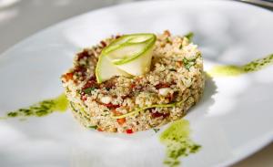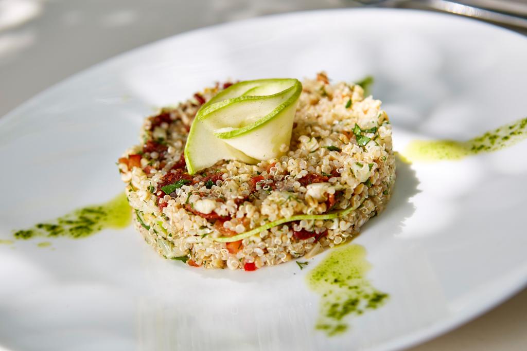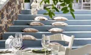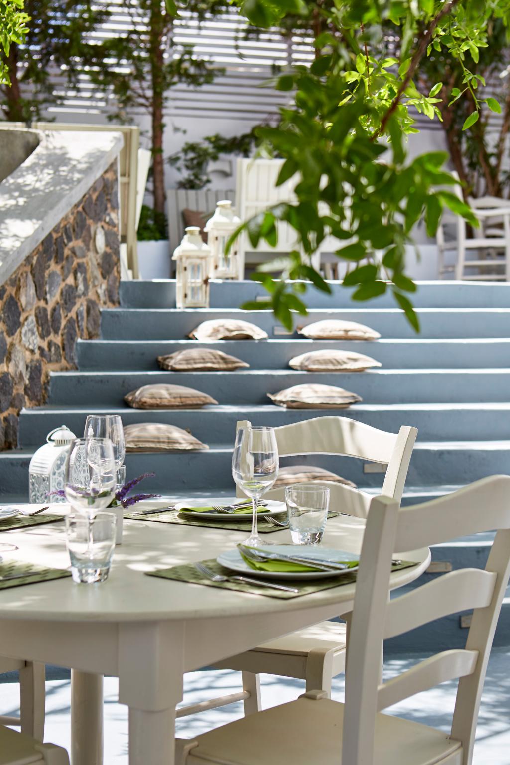 Από νωρίς το πρωί και όλη την ημέρα, ο χώρος επιδεικνύει μοντέρνα αισθητική καθώς δίνει μια αίσθηση ηρεμίας και δροσιάς από τα δέντρα και τα φυτά. Σε ένα ανεπιτήδευτο, φιλικό και χαρούμενο περιβάλλον, προσφέρουμε εξαιρετικές υπηρεσίες, πρωινά, καφέ, επιδόρπια, σνακς και υψηλής ποιότητας μοντέρνο Ελληνικό φαγητό σε συνοδεία περίπου 100 επιλεγμένων οίνων από τον ηφαιστειακό αμπελώνα του νησιού και από άλλες περιοχές της Ελλάδας..