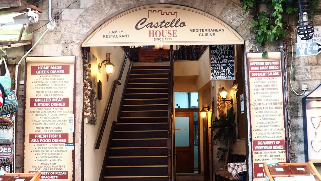 Το εστιατόριο Castello House αποτελεί καθαρά οικογενειακή επιχείρηση από το 1975. Η κουζίνα του είναι ελληνική Μεσογειακή με επιρροές από την Διεθνή Κουζίνα με στόχο να καλύψει γευστικά μεγάλη γκάμα κόσμου. Όλα τα υλικά για την παρασκευή των φαγητών είναι παραδοσιακά από το νησί της Ρόδου.
