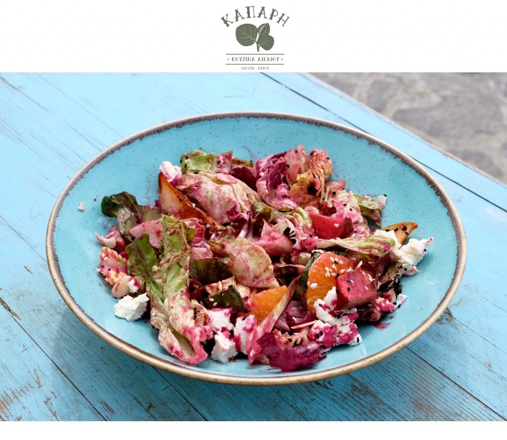 Στην ΚΑΠΑΡΗ θα δοκιμάσετε φρέσκο χταπόδι με κριθαράκι, σαλατουρι φτιαγμένο με καλκάνι και συνταγή του ψαρά παππού μας, σαλιγκάρια με ντομάτα και κρεμμύδια, χοιροβοσκους και κριταμο τουρσί, παραδοσιακή ρεβυθαδα ψημένη στο τσουκαλι κ. α.