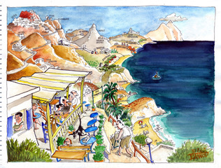 Η βεράντα του προσφέρει μοναδική θέα στο αλωνάκι του Αιγαίου. Ξεκίνησε να λειτουργεί το 1984 σαν καφενείο, αλλά αμέσως μετά από λίγα χρόνια άρχισε να προσφέρει φαγητό και φιλοξενία. Η κουζίνα είναι παραδοσιακή ελληνική με ιδιαίτερη έμφαση στα νησιώτικα πιάτα.