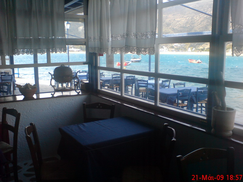 Στον πλούσιο κατάλογο των εδεσμάτων με τα ελληνικά φαγητά και, τους θαλασσινούς μεζέδες ξεχωρίζουν τα ολόφρεσκα ψάρια που μας προμηθεύουν καθημερινά οι Νιώτες και οι Καλύμνιοι ψαράδες τα οποία ψήνονται στα κάρβουνα, η αστακομακαρονάδα, το γιουβέτσι με γαρίδες και μύδια (κορυφαίο πιάτο), η μαρινάρα, το χταποδάκι που το μαγειρεύουμε με τέσσερις ξεχωριστούς τρόπους, το τηγανιτό ρύζι με θαλασσινά, η ψαρόσουπα και οι νησιώτικοι ρεβυδοκεφτέδες. Όλα αυτά συνοδεύονται από το πολύ καλό Κυκλαδίτικο χύμα κρασί ή το παραδοσιακό καραφάκι ούζο από το Πλωμάρι της Λέσβου.