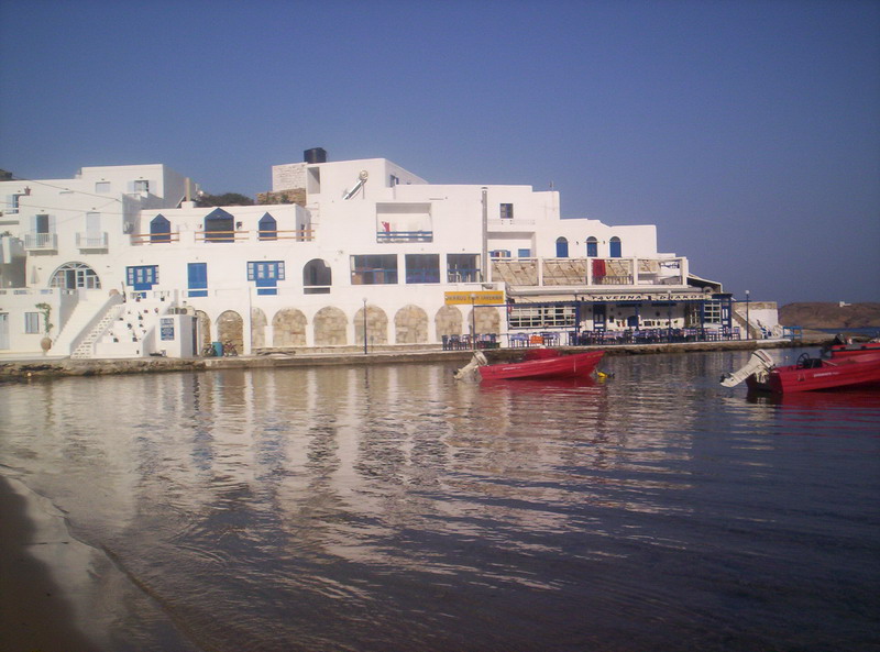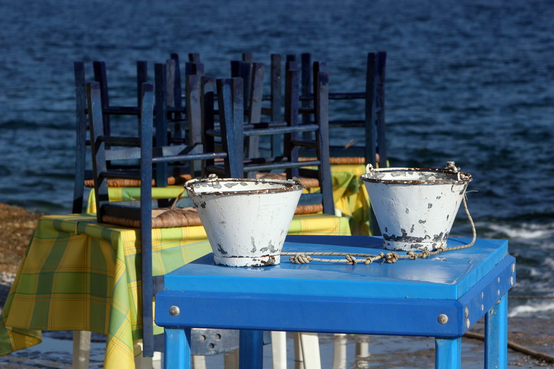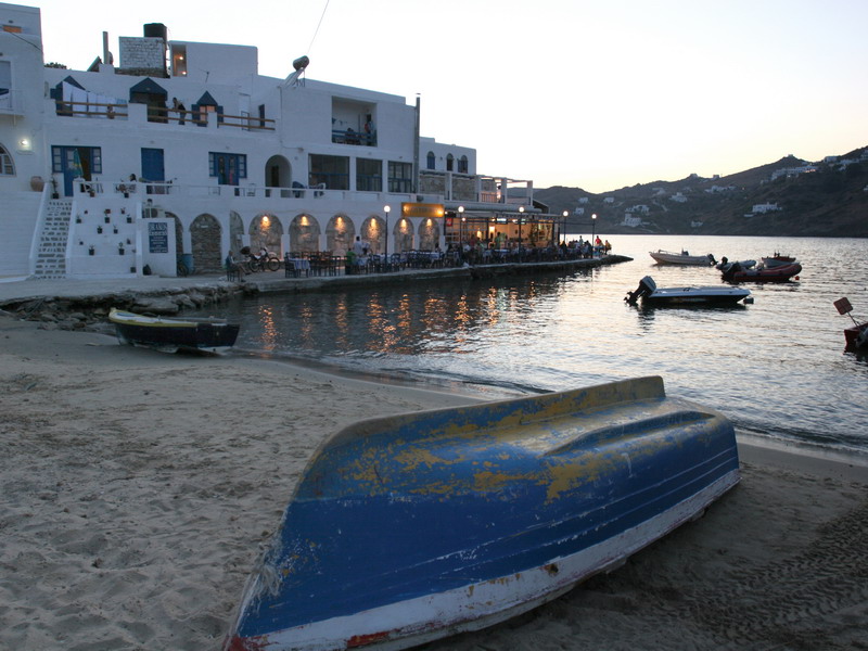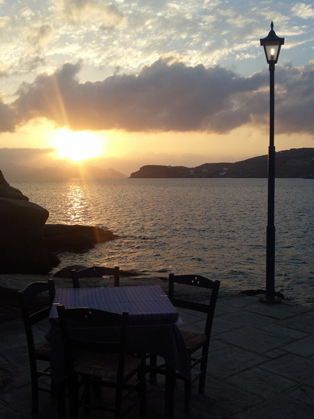 Στην Ίο, το εστιατόριο του Γιώργου Δράκου «κλείνει» τη μια άκρη του θρυλικού Μυλοπότα, σαν μικρό ακρωτήρι. Υπάρχει εκεί από τις αρχές της δεκαετίας του ’60, από τότε δηλαδή που οι χίπις παραθέριζαν στις γύρω σπηλιές. Πίσω από το εστιατόριο κρύβεται ο ήλιος όταν πάει να βασιλέψει. Είναι κομμάτι του τοπίου, σαν τη φαρδιά αμμουδιά, τα βράχια και τα σπίτια των γάλλων ζωγράφων στην απέναντι μεριά της παραλίας. Οι βάρκες είναι δεμένες και τα δίχτυα σωριασμένα κοντά στις μπλε καρέκλες. Τα κεφαλόπουλα τριγυρίζουν δίπλα ακριβώς, όπως και οι γάτες, τσιμπολογούν τα ψίχουλα που πέφτουν από τα τραπέζια στο νερό.