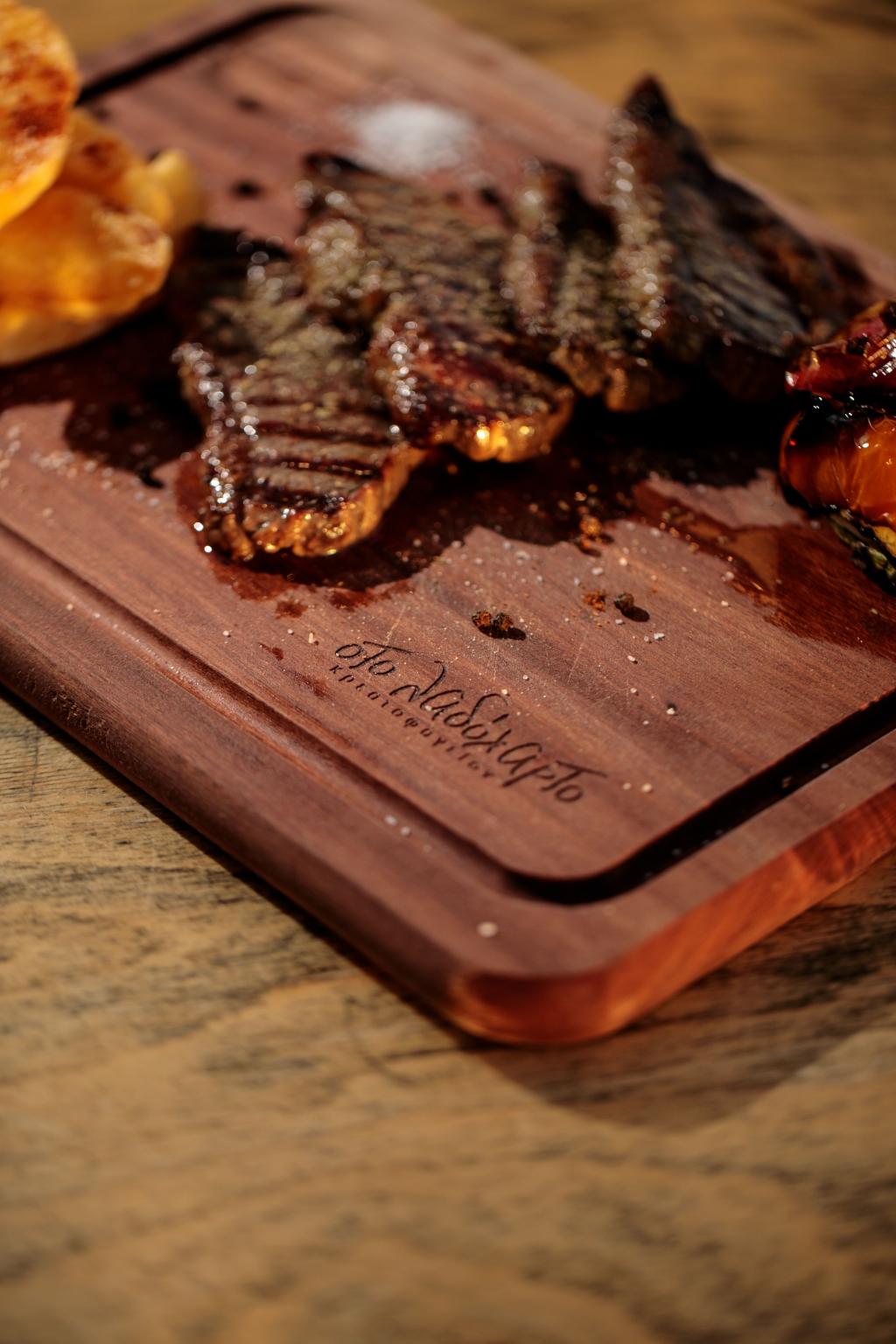 Η φιλοσοφία του βασίζεται στη σωστή απόδοση του κρέατος όπως το προτιμάει ο πελάτης...., ώστε όλη η γεύση και η αυθεντικοτητα των τοπικών θησαυρών να απολαμβάνονται στο ακέραιο την ίδια ώρα που θρεπτικές ουσίες παραμένουν πλούσιες. Εκτός από την άριστη γνώση και προσφορά των ποιοτικών steaks, θα βρείτε τοπικά προϊόντα όπως Ναξιωτικο τυρί σε συγκλονιστικες προτάσεις ορεκτικών και την γευστικότερη μαρμελάδα τομάτας που συνοδεύει την τριλογία Ναξιωτικων παναρισμενων τυριών που έχετε δοκιμάσει ποτέ! Εννοείτε πως θα απολαύσετε τις διάσημες τηγανιτές πατάτες της Νάξου όπως δεν τις έχετε απολαύσει πουθενά, "κυδωνατες '' στο Λαδόχαρτο που δεν θα βρείτε αλλού στο νησί!! Το ψωμάκι είναι επίσης χειροποίητο.
